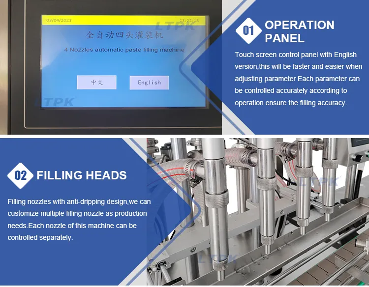 The LT-QZDG4 automatic paste filling machine features a compact design and aesthetic appearance, suitable for a wide range of applications. Integrated with imported high-quality components, the machine ensures stable performance and durability. It can be equipped with mixing and heating functions, making it ideal for materials like pepper sauce and chocolate. Each nozzle is independently controllable, providing high flexibility for food, beverage, and chemical industries.