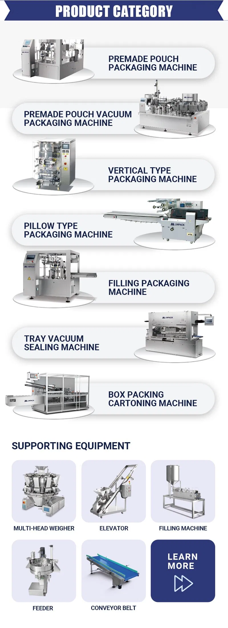 The machine is compatible with various premade pouches, including composite material bags, stand-up bags (Doypack), handle bags, zipper bags, and 3-side or 4-side sealed bags.